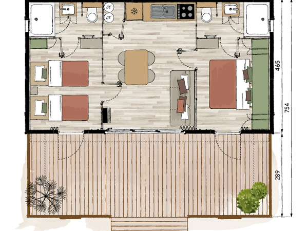 Mit Familie oder Freunden bieten diese Chalets Platz für 5 Personen und profitieren von einer dreifachen Terrasse für maximalen Sonnenschein. Die 180-Grad-Belichtung ermöglicht Ihnen ein ultrahelles Wohnzimmer mit zwei großen Öffnungen, die das Licht durchlassen und den Charme und Komfort der Chalets in vollen Zügen genießen können. Mit einer Luxusküche kombiniert mit moderner Ausstattung, die direkt auf die überdachte Terrasse führt, sind sie darauf ausgelegt, unvergessliche Momente der Geselligkeit und Entspannung zu erleben. Sie bestehen außerdem aus zwei geräumigen Schlafzimmern, einem Hauptschlafzimmer mit einem Doppelbett und einem Schlafzimmer mit zwei Einzelbetten. Sie haben endlich ein Badezimmer und eine separate Toilette.