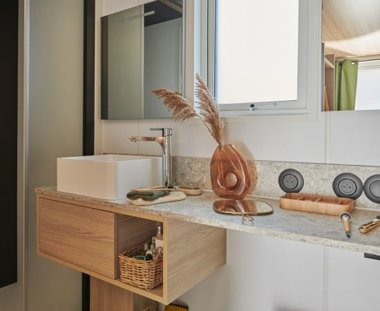 With family or friends, these chalets can accommodate 5 people and benefit from a triple terrace for maximum sunshine. The 180 exposure allows you to have an ultra bright living room with two large openings to let the light pass through and fully enjoy the charm and comfort of the chalets. With a luxury kitchen combined with modern equipment opening directly onto the covered terrace, they are designed to experience unforgettable moments of conviviality and relaxation. They are also composed of two spacious bedrooms, a master bedroom with a double bed and a bedroom with two single beds. They finally have a bathroom and a separate toilet.